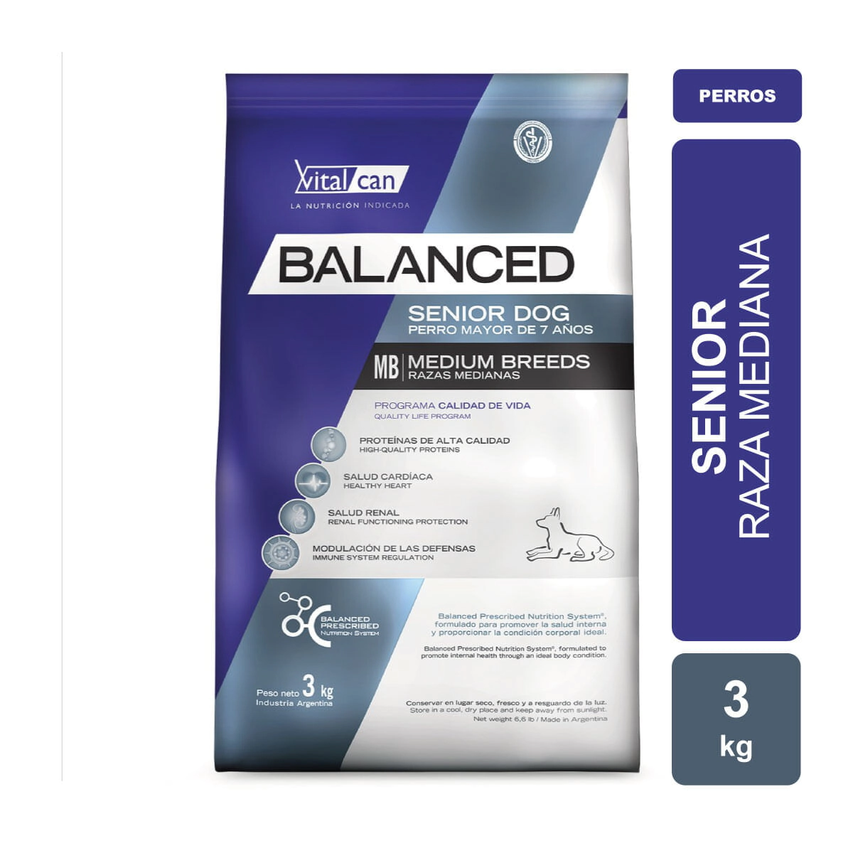 Vitalcan Balanced Perro Senior Raza Mediana x 3kg indicado para perros maduros de raza mediana mayores de 7 años.