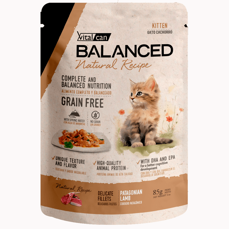 Alimento Húmedo Vitalcan Balanced Natural Recipe Gato Cachorro Delicados Filetes de Cordero Pouch x 85gr.