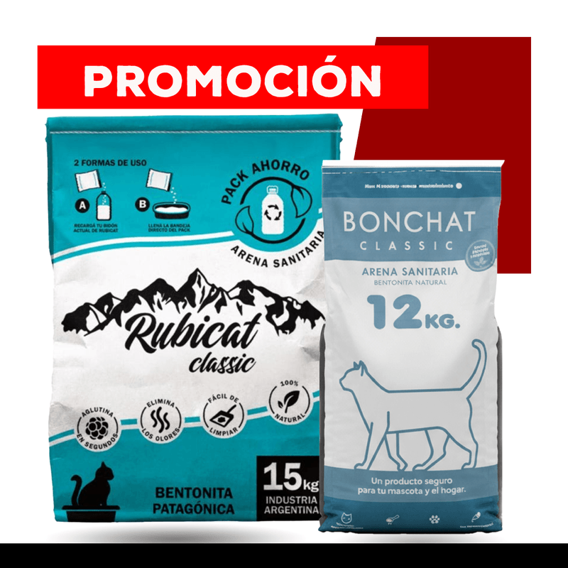 Arena Sanitaria Rubicat Classica Pack Familiar x 15kg + Piedra Aglomerante Sanitaria Bonchat Neutra x 12kg esta compuesto por bentonita fina, es un producto natural, totalmente amigable con el medio ambiente, que tiene gran capacidad de absorción y poder aglutinante. Puede emplearse como arena para gatos, y permite una limpieza fácil y rápida, simplemente se retiran los terrones aglutinados y se repone el granulado. Neutraliza olores, dado que sus ingredientes absorben todo tipo de líquidos y gases, facilitando una convivencia sana.