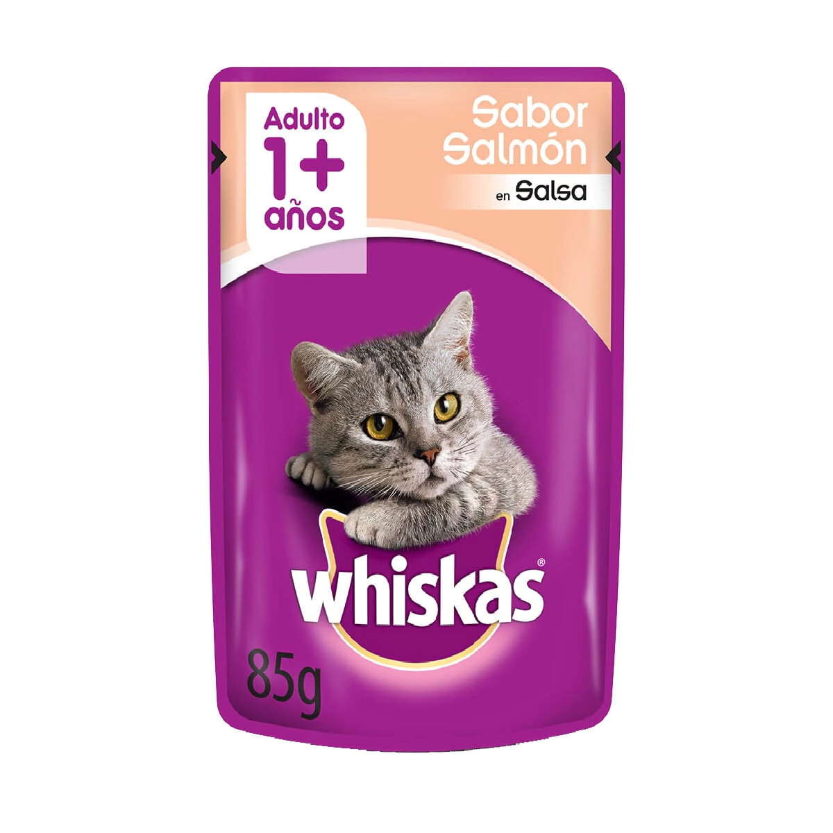 Alimento Whiskas Gato Adulto Sobre sabor Salmon en Salsa x 85gr balanceado y completo destinado a la alimentación de gatos adultos.