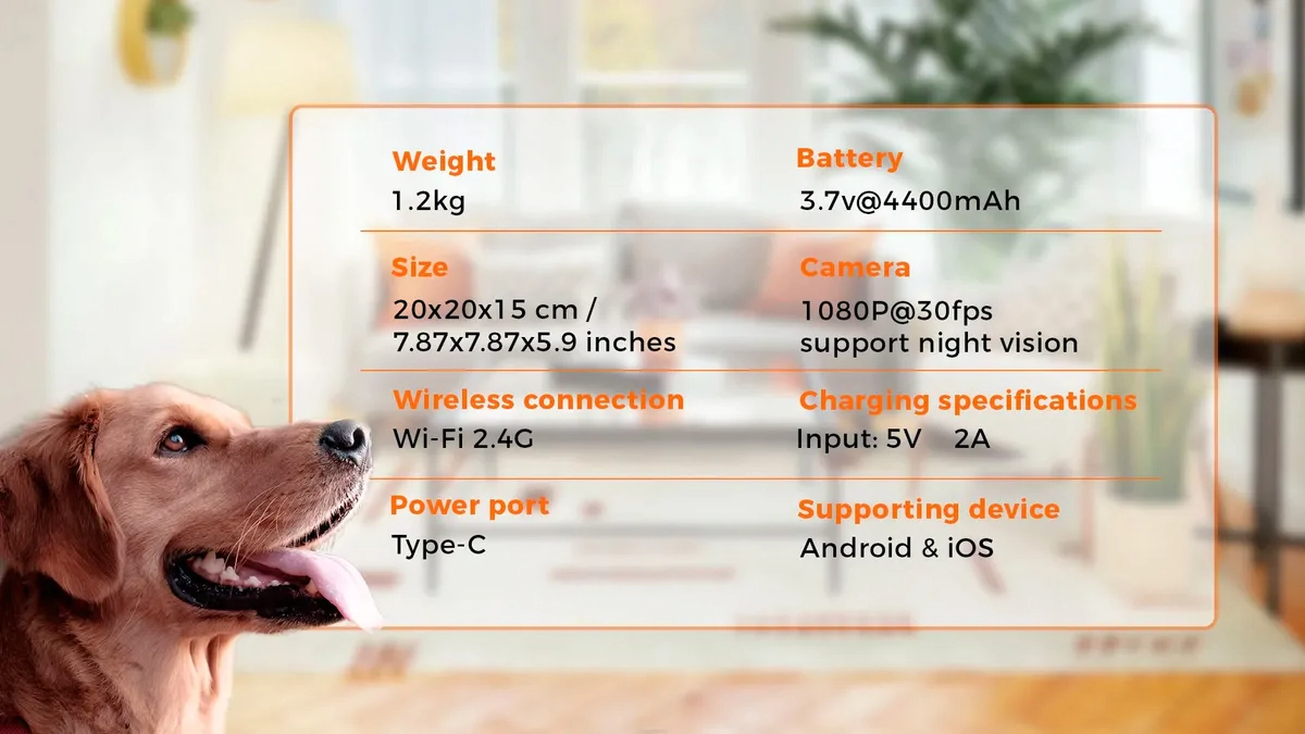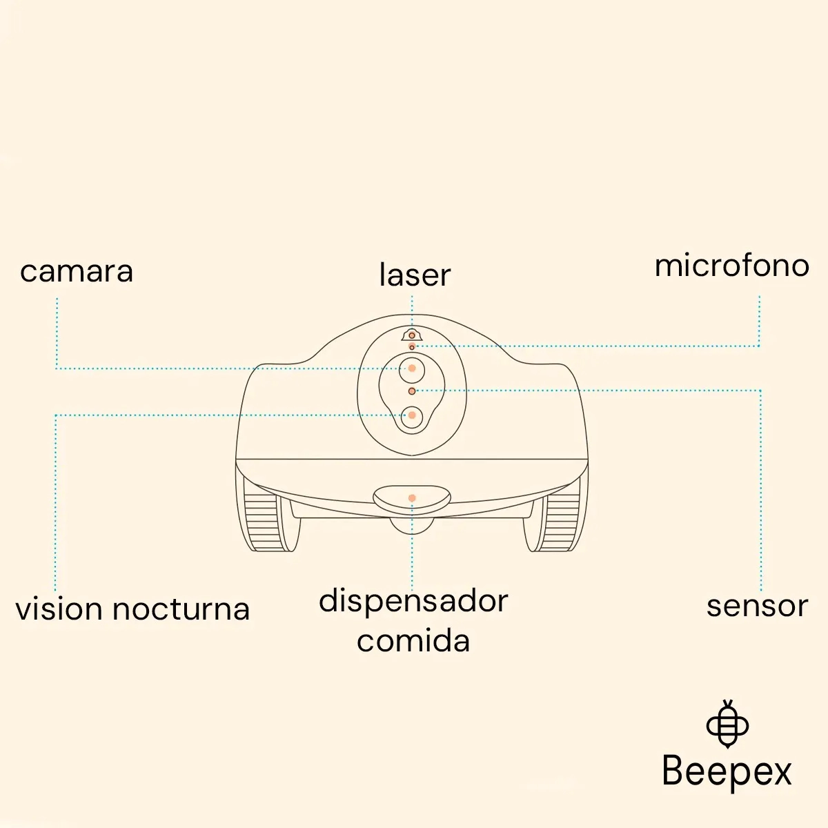 Robot inteligente móvil diseñado para que puedas vigilar, entretener y alimentar a tu mascota a distancia. Cuenta con cámara HD, audio bidireccional y un dispensador automático de golosinas integrado.