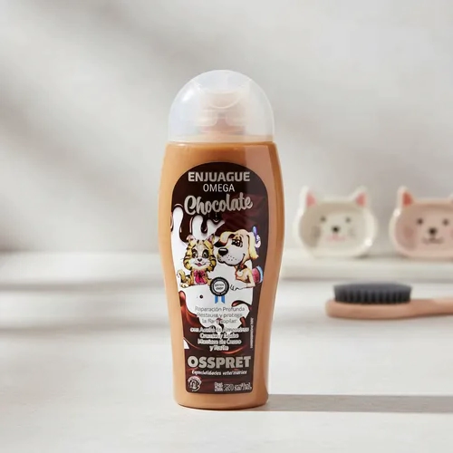 ENJUAGUE PARA PERROS OSSPRET CHOCOLATE OMEGA 250 ML PREMIUM CARACTERÍSTICAS PRINCIPALES: ACONDICIONADOR O ENJUAGUE LÍQUIDO PREMIUM DE LA MARCA OSSPRET, FORMULADO PARA USAR DESPUÉS DEL SHAMPOO. CONTENIDO DE UN COMPLEJO DE ÁCIDOS GRASOS ESENCIALES OMEGA QUE AYUDAN A NUTRIR Y RESTAURAR LA ESTRUCTURA DEL PELAJE. SU FÓRMULA INCORPORA UN ATRACTIVO AROMA A CHOCOLATE, COMPLEMENTARIO AL SHAMPOO DE LA MISMA LÍNEA. PRESENTACIÓN EN ENVASE DE 250 ML, DISEÑADO PARA DESENREDAR Y APORTAR SUAVIDAD AL PELAJE. BENEFICIOS DESTACADOS: HIDRATACIÓN Y NUTRICIÓN: LOS COMPONENTES OMEGA PENETRAN LA CUTÍCULA DEL PELO, APORTANDO UNA HIDRATACIÓN INTENSA Y AYUDANDO A PREVENIR LA SEQUEDAD. DESENREDO FÁCIL: SU FORMULACIÓN FACILITA EL DESENREDADO INMEDIATO DEL PELAJE HÚMEDO O SECO, MINIMIZANDO LA ROTURA DEL PELO. BRILLO Y SUAVIDAD DURADERA: DEJA EL MANTO SUAVE, MANEJABLE Y CON UN BRILLO SALUDABLE Y UN AGRADABLE PERFUME A CHOCOLATE. REFUERZO CUTÁNEO: AYUDA A REFORZAR LA BARRERA PROTECTORA DE LA PIEL AL SELLAR LA HUMEDAD.