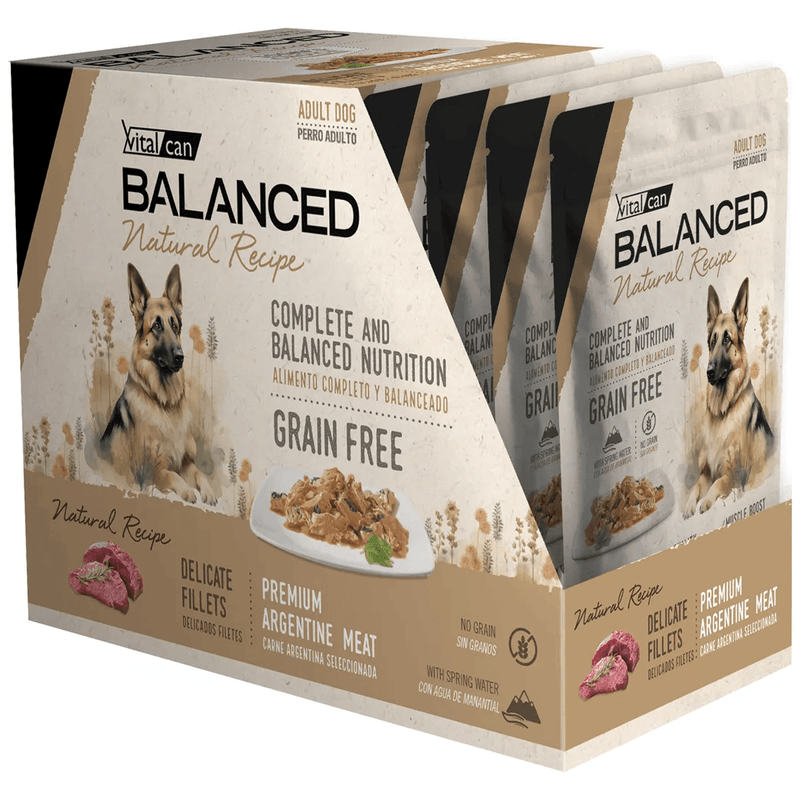 PerroAlimentosAlimentos HúmedosPROMO Caja x 12 Unidades de Alimento Húmedo Vitalcan Balanced Natural Recipe Perro Adulto Delicados Filetes de Carne Pouch x 100gr.