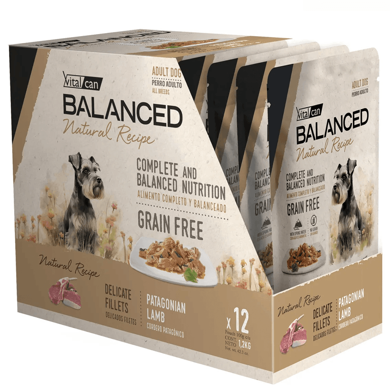 PerroAlimentosAlimentos HúmedosPROMO Caja x 12 Unidades de Alimento Húmedo Vitalcan Balanced Natural Recipe Perro Adulto Delicados Filetes de Cordero Pouch x 100gr.